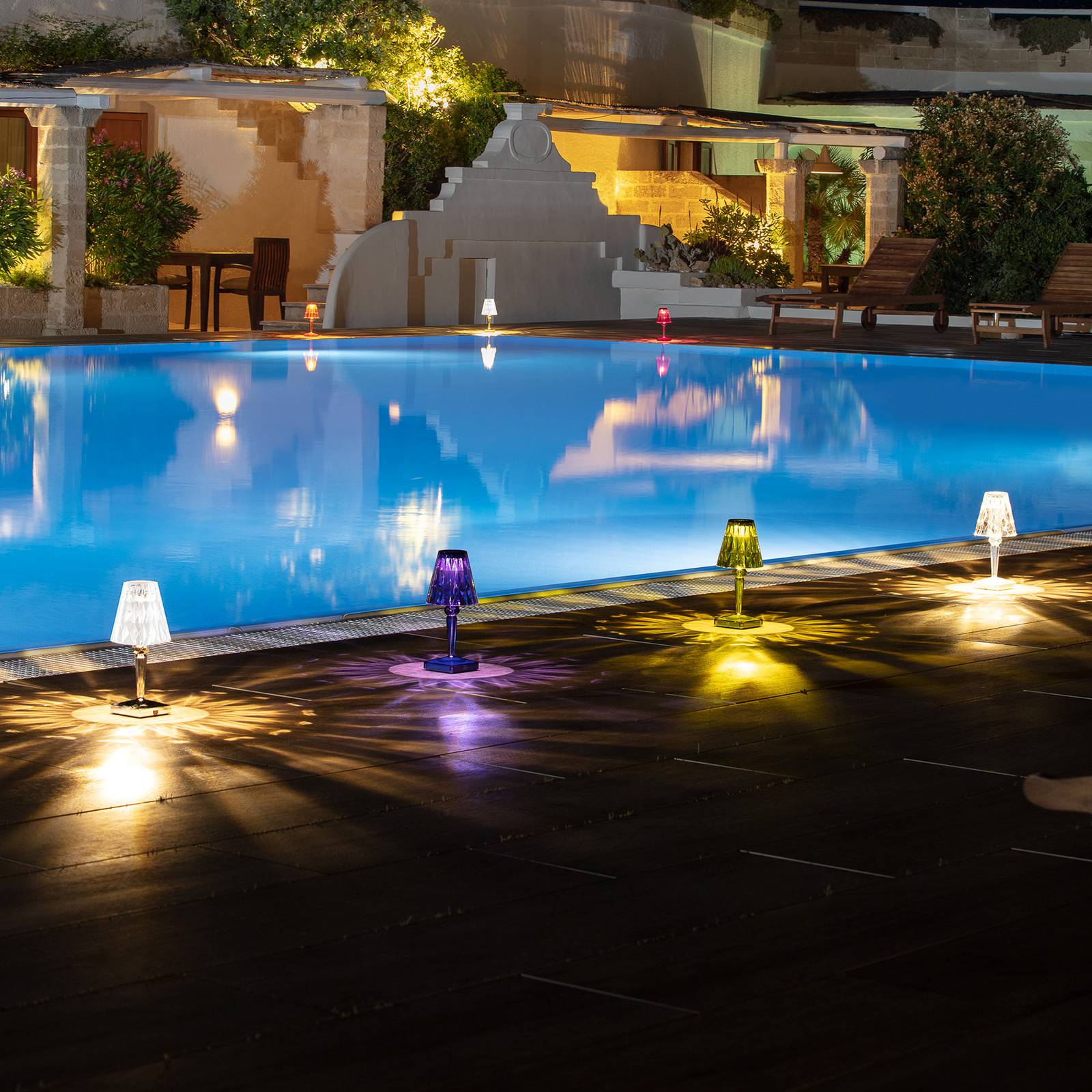 Con accumulatore: lampada da tavolo Battery per esterni La piccola lampada da tavolo LED Battery è un decorativo e pratico complemento d'arredo per esterni. A tale scopo è costruita in protezione IP54 e quindi resistente agli agenti atmosferici. Dal momento che è alimentata da un accumulatore, la si può appoggiare in un punto qualsiasi della terrazza o del balcone. Costituisce un elemento di stile anche in caffè e ristoranti. L'accumulatore si ricarica con un cavo USB e mantiene la luce accesa per un massimo di 6 ore. Le sfaccettature del paralume trasparente diffondono incantevoli giochi di luce. Il marchio milanese Kartell è celebre per i suoi capolavori del design in plastica. Da oltre 60 anni produce mobili, oggetti di consumo e corpi illuminanti di design, sempre fatti di questo materiale. Nel corso degli anni Kartell ha vinto molti premi ed ha anche istituito un suo proprio museo che custodisce l'eredità culturale dell'azienda.