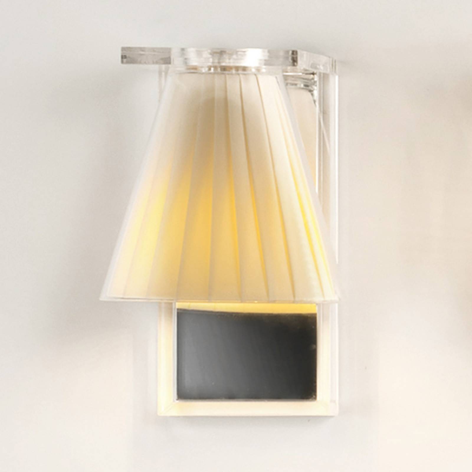Light-Air apparecchio di design a LED per la parete di Eugeni Quitllet La moderna lampada da parete a LED Light-Air è fatta di plastica trasparente, ma ha un punto forte all'interno del paralume: un paralume in tessuto beige inserito nell'apparecchio che si apre verso il basso. La fonte di luce si trova sotto il paralume in tessuto e brilla principalmente verso il basso. In questo modo, la luce viene rifratta dal paralume ed emessa più dolcemente nella stanza, il che contribuisce ad un'atmosfera ancora più accogliente. In generale, la lampada è mantenuta molto puristica senza molti dettagli e ghirigori, il che enfatizza il paralume in tessuto e il mix di materiali di plastica e tessuto. Il marchio italiano Kartell è noto per i suoi mobili in plastica. Il fatto che sia stato usato un paralume in tessuto per questa lampada da parete è qualcosa di insolito per Kartell. Le lampade di Kartell sono create da vari designer internazionali, in questo caso è stato il designer catalano Eugeni Quitllet che ha progettato la serie di lampade Light-Air.