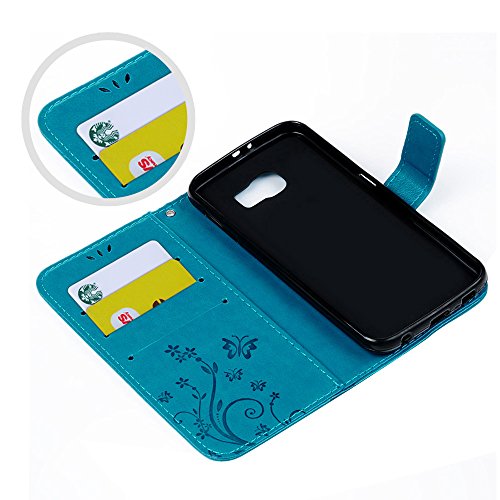 Kasos - Custodia in pelle PU [motivo floreale farfalla] con stilo, tappo antipolvere in cristallo e protezione per lo schermo per Samsung Galaxy S6 Samsung Galaxy S6 Blu