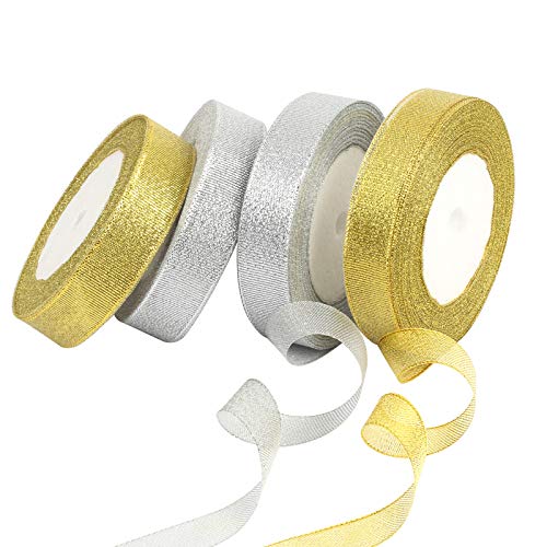 KATOOM Nastro di Organza,4 PCS Organza Ribbon Oro e Argento 2 cm di Larghezza Flash Decorazione Regalo Matrimonio Partito Natale Compleanno Festa della Mamma Festa del papà