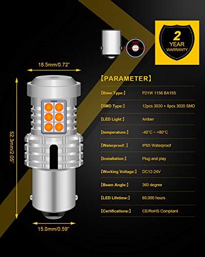 ★ 【1156 BA15S lampadine LED】(Confezione da 2)Ogni lampadina ha 12 pz 3030 SMD e 8 pezzi 3020 SMD LED chip.Colore: Giallo ambrato.Tensione: 12V-24V.La potenza nominale è di circa 24W.4000 Lumen Output (2000Lms per lampadina). Alta qualità e LED estremamente luminoso lampadine.