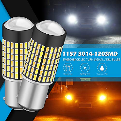 ★ 【1157 Switchback Led】 (Confezione da 4 lampadine) Elevata potenza 120 pezzi Chipset LED 3014 per lampadina, protetto con lenti di proiezione per la massima resa luminosa e una migliore distribuzione del calore. Durata della vita lunga: 60.000 ore, Tensione operativa: 9-30 V, Potenza in uscita: 3,5 W / lampadina (bianca), 6 W / lampadina (ambra), Lunghezza: 2,25 ", Diametro: 0,69".