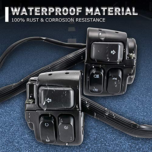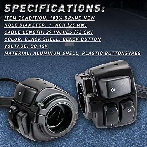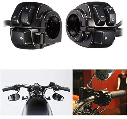 Prodotto consigliato per via della facile installazione. Facile e comodo accesso ai comandi di controllo. Con pulsanti per fari per abbaglianti e anabbaglianti, clacson, indicatore di direzione, pulsante per accendere e spegnare le luci, dimensione compatta. Design tutto in 1. Interruttore di controllo integrato, compatibile con: Harley Softail, dal 1996 al 2012, per Dyna, Sportster, per V-Rod con diametro del manubrio da 25 mm.