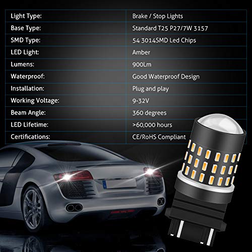 ★ 【3157 LED Lampadine】 Ogni lampadina ha 54 pz di alta potenza 3014 chip LED, corrente elettrica di uscita 0,25 A, la potenza nominale è di circa 3,1 W, ambra, tensione: 12 V a 24V.650 Lumens Output ed è progettato per durare 50.000 ore - 50 volte più a lungo delle lampade a incandescenza. Estremamente luminoso, ultra brillante e a risparmio energetico.
