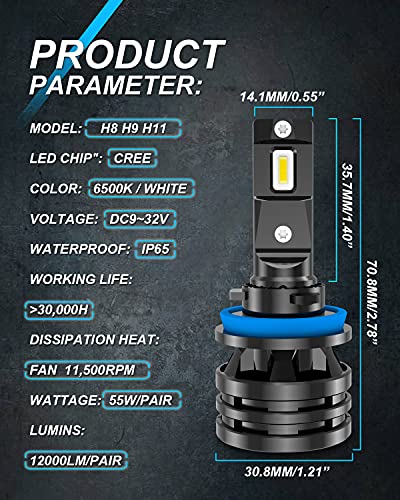 ★ 【Lampadine H8 H9 H11 Led Headlight】Pack (Confezione da 2) Perle microsfere personalizzate CREE quadrate su corpo compatto, 6500K Xenon White, funzionano a 55 W (27,5 W per lampadina). Lunga durata: 30.000 ore, Tensione operativa: CC 9- 30 V (adatto per veicoli 12V, 24V). Uscita da 12000 lumen (6000 Lms per bulbo). Alto lumen ed estremamente luminoso.