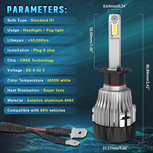 ★ 【 H1 Lampadine per fari a led】 (confezione da 2) Temperatura di colore: 6500 K Xenon White. Funzionamento a 60 W (30 W per lampadina). Tensione di funzionamento: DC 9-32 V (per veicoli 12V, 24 V). Uscita 10000 lumen (5000 Lms per lampadina ), molto più della lampada alogena e della lampada HID.