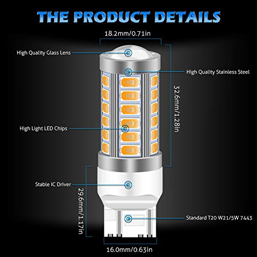 ★ 【Lampadine a LED 7443】 La lampadina a risparmio energetico Super Bright Amber 5630 SMD (33 LED) ha una tensione operativa di 12 V ed è progettata per durare 50.000 ore - 50 volte più a lungo rispetto alle lampade a incandescenza.