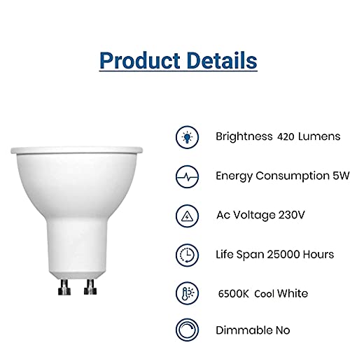 [Sostituzione perfetta] Luminose come una lampadina alogena da 50 W, le lampadine a LED GU10 consumano solo il 10% di energia, ma forniscono un'uscita luminosa di 420 lumen e un colore bianco freddo 6500K accurato. Non dimmerabile.