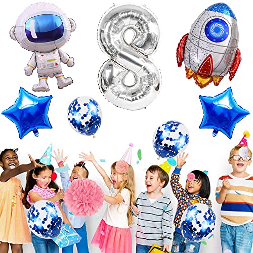 Kawailay Set di palloncini con astronauti per compleanno, decorazione per 8 anni, astronauti a razzo, in pellicola, argento, numero 8, palloncini in alluminio per bambini ragazzi, ragazze, compleanni