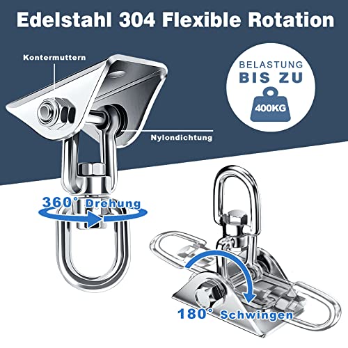 【Oscillazione Libera a 360°】 I nostri ganci da soffitto consentono un'oscillazione completa a 360°. Il gancio oscillante impedisce grovigli o torsioni. Il design innovativo garantisce un utilizzo più ampio e flessibile. Ottimo per altalene, amache, sedie sospese, sacchi da boxe