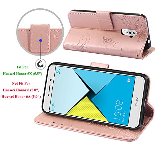 Kazineer Cover Honor 6X, Honor 6X Cover Flip Caso in pelle Modello Fiore Portafoglio Custodia per Huawei Honor 6X (Oro Rosa)