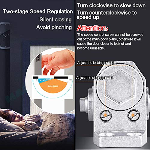 【Ammortizzatore idraulico】 Il chiudiporta idraulico può chiudere automaticamente e silenziosamente la porta e la velocità di rotazione e bloccaggio può essere regolata in sezioni. Può garantire la sicurezza d'uso, nessun pizzicamento delle mani e maggiore tranquillità.