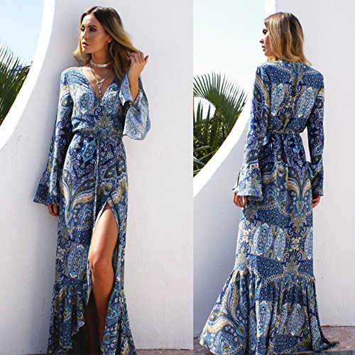 KE1AIP Donne di Boho Allentato V Neck Beach Cover-up Manica Lunga Laterale Slittamento Vestito Stampato Bendaggio Regolabile (One Size(Specific Dimensions See Description), Lake Blue)