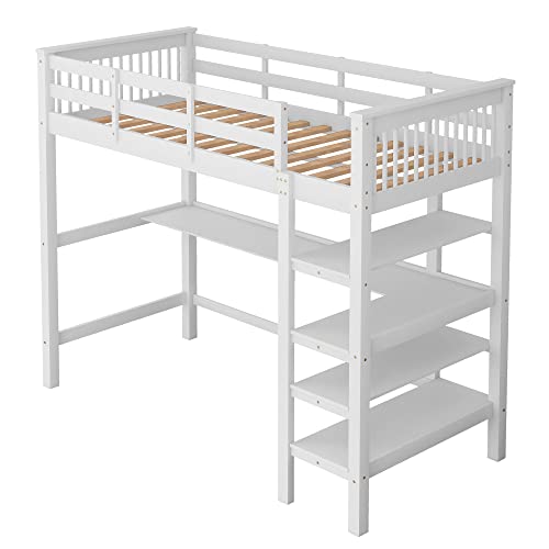 KecDuey Letto a castello, letto a soppalco per bambini con rete a doghe in legno, con scale, ripiani e scrivania sotto il letto (bianco, 90 x 200 cm)