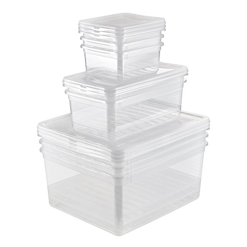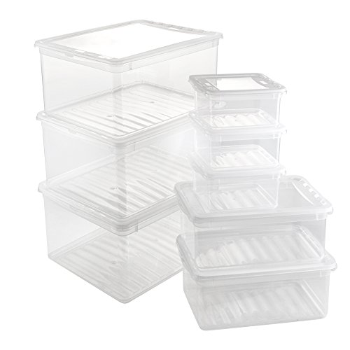 Contenuto: 1 Confezione da 8 Box Contenitori, Bea, 30050, 3x 1,7 L (Dimensioni: 19,5 x 16,5 x 8,5 cm), 2x 5,6 L (Dimensioni: 33 x 19,5 x 12 cm), 3x 18 L (Dimensioni: 39 x 33,5 x 18 cm), Trasparente