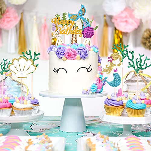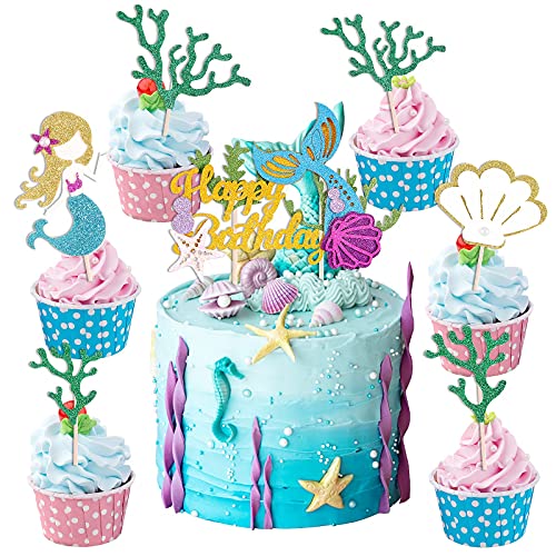 Facile da usare - decorazioni per torte con sirena, corallo e conchiglia possono essere utilizzate direttamente. La decorazione della torta di buon compleanno deve essere assemblata da solo, basta usare la colla per incollare il bastoncino sul retro della carta glitterata.