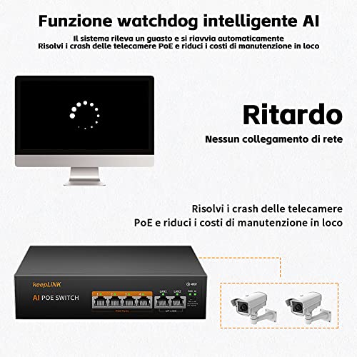 KeepLiNK Switch Poe 6 Porte con 4 Porte Poe+, 2 Porte Uplink, 10/100Mbps, Switch Poe da 65W, IEEE802.3af/at, Plug And Play, Metallo Senza Ventola
