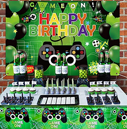 KEFAN Pacchetto Sfondo e copritavolo per Videogioco Festa di Compleanno, Gioco di Buon Compleanno su Sfondo, copritavolo in plastica a Tema Gioco (Verde)