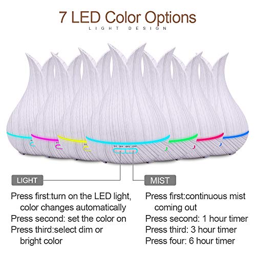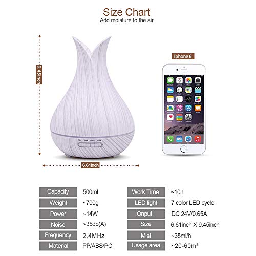 Gran Capacidad y Gran Salida de Niebla: El difusor de aroma de 400 ml puede funcionar hasta 6-12 horas con 30-80 ml / H. Puede durar todo un día o una noche. Se adapta a la habitación: 300 pies cuadrados. Apagado automático cuando se agota el agua, lo que garantiza la seguridad.