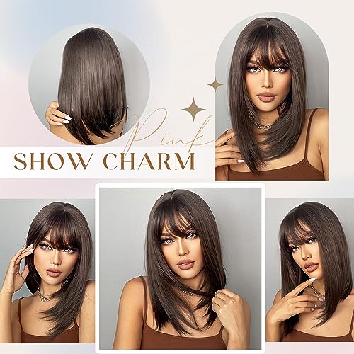 Kellynee Parrucca marrone scuro con frangia - Parrucche marroni di media lunghezza per donne, capelli naturali lisci realistici, migliori parrucche sintetiche per tutti i giorni, Halloween, feste,