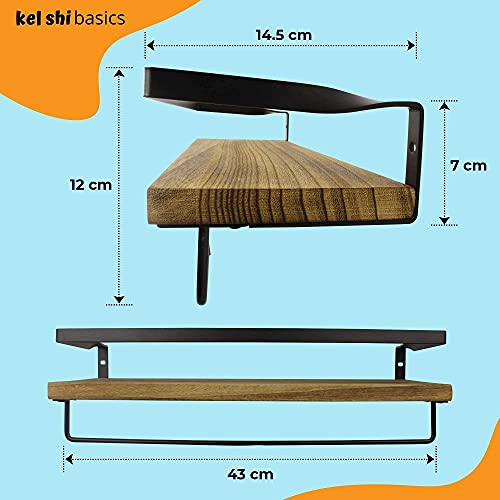 Kelshi - 2 scaffali da parete ideali per cucina, camera da letto, bagno, corridoio, soggiorno, design industriale con portasciugamani, 100% vero legno, colore marrone