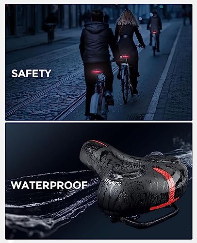 【Impermeabili e Strisce Riflettenti】 La sella per bici in gel è realizzata in pelle e materiale esterno in silicone, impermeabile ed efficiente, non c'è bisogno di preoccuparsi che la spugna interna si bagni. La parte posteriore del cuscino del sedile ha uno speciale nastro rosso riflettente per migliorare la sicurezza dei motociclisti che guidano di notte.