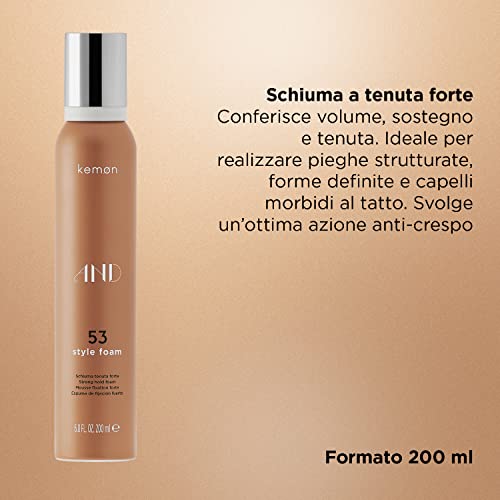 Kemon - AND 53 Style Foam, Schiuma Capelli con Azione Anticrespo, Tenuta Forte, 200 ml