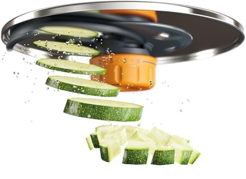 DISCHI DA TAGLIO REGOLABILI 6 IN 1: è possibile scegliere lo spessore desiderato grazie alle 6 opzioni di altezza taglio da fine a spessa, e alla possibilità di tagliare a cubetti.