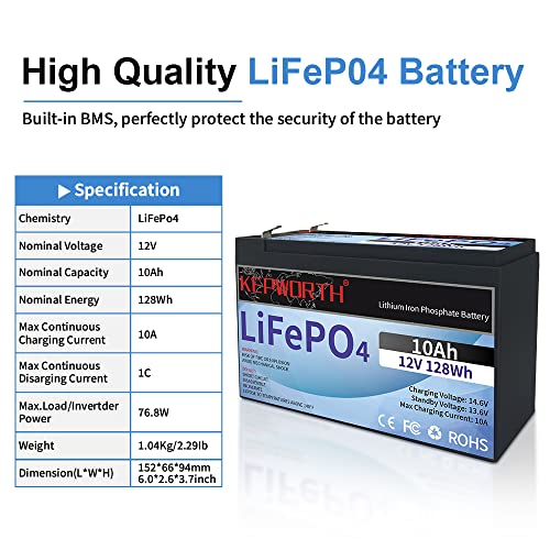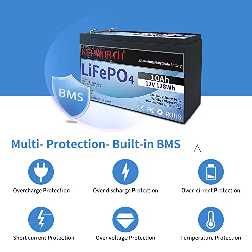 KEPWORTH Batteria al Litio LiFePO4 12V 10Ah Ferro Fosfato Ricaricabile con Oltre 3000 Volte Deep Cycle e Protezione 10A BMS per Kit Pannello Solare,barca, Scooter,Trolling Motor, Famiglia
