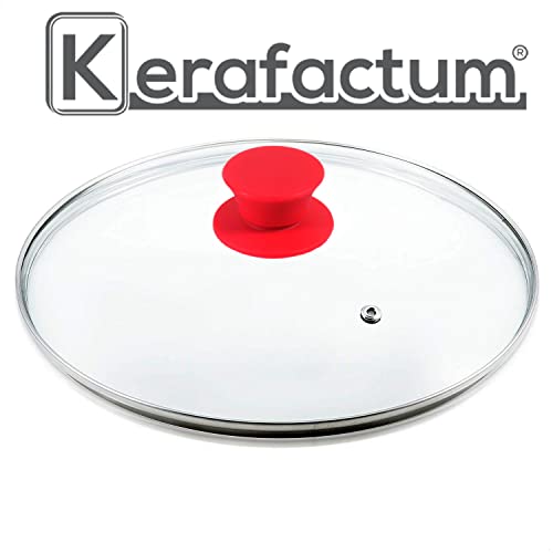 Kerafactum Coperchio per pentola in vetro (Ø 12 cm), lavabile in lavastoviglie, coperchio universale resistente al calore, per pentole e padelle, vetro temperato di qualità con foro per vapore, manico di alta qualità, in silicone rosso