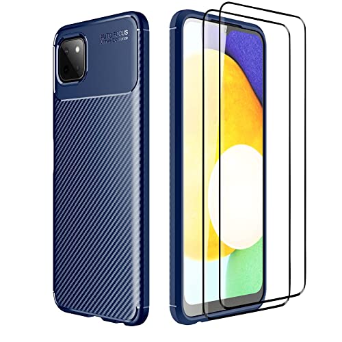 KERUN Fibra di Carbonio Cover per Samsung Galaxy A22 5G e 2 Vetro Temperato, Custodia Protezione in Morbida Silicone TPU Anti-Graffio e Antiurto Flessibile Protettiva Case. Blu