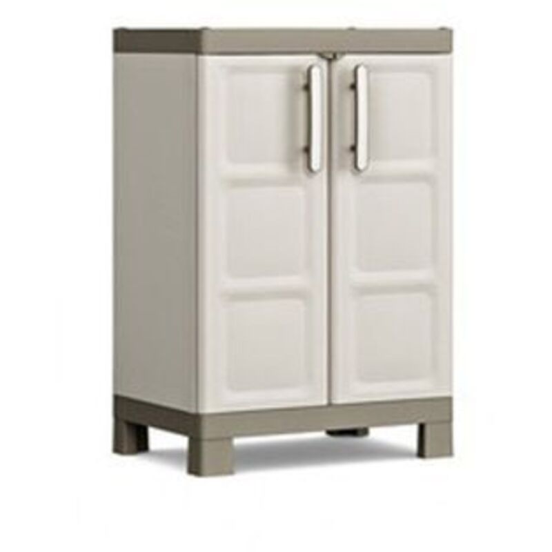 In plastica. con 2 ripiani, portata 15 kg a ripiano, piedini rialzati e scaffali regolabili. lucchettabile, maniglioni ergonomici. soluzione compatta, ideale per ottimizzare gli spazi all'interno e all'esterno della casa. prodotto certificato en14749.cm 6