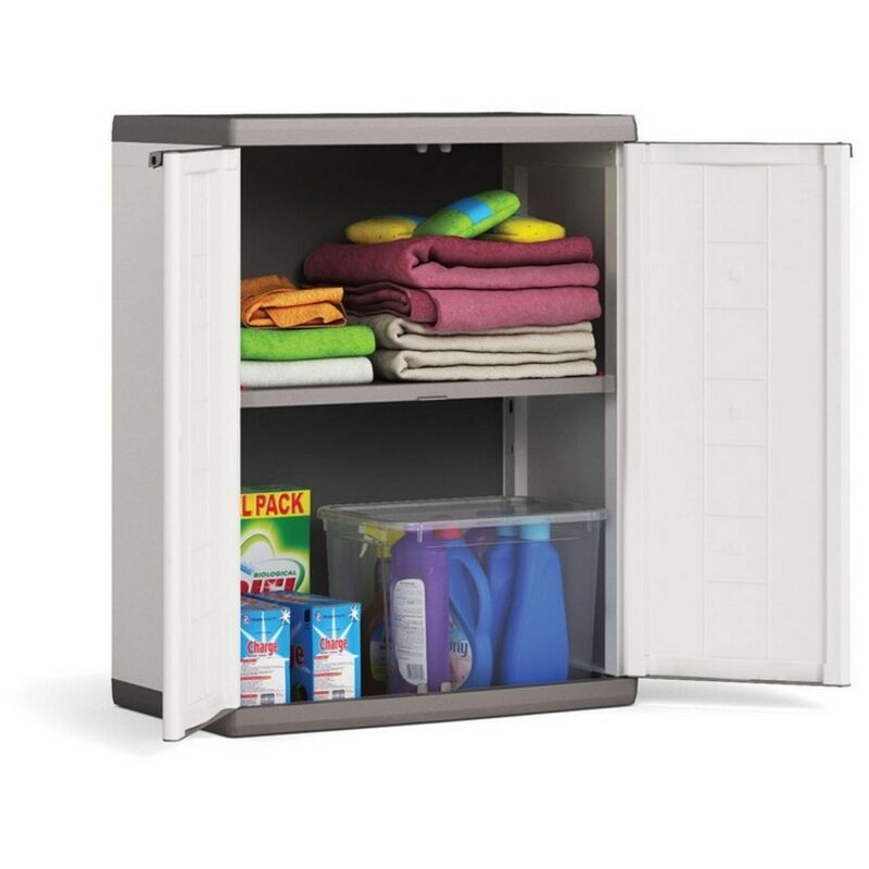 In resina, 1 ripiano regolabile in altezza, portata max per ripiano kg. 15, lucchettabile.