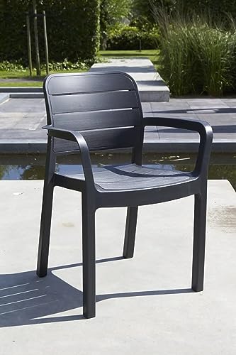Include una sedia da giardino con braccioli disponibile nei colori: grafite e bianco.