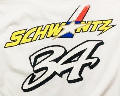 Sul retro della maglietta c'è un disegno stampato Schwantz No.34. Il suo numero 34 è stampato sulle maniche.
