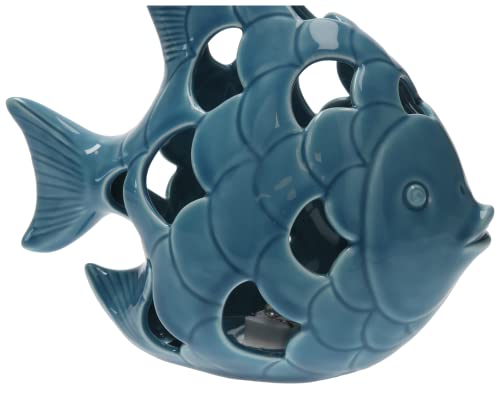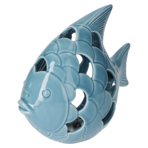 Keyhomestore- Statuina a Forma di Pesce in Ceramica Traforata con LED, Altezza 18 cm, di Colore Azzurro, Finitura Lucida, Ideale Come soprammobile per Interni.