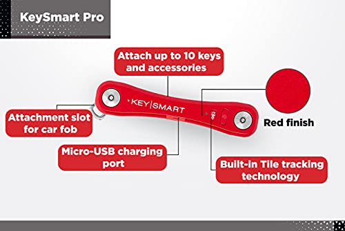 KeySmart Pro - Portachiavi compatto con luce LED e tecnologia smart Tile, localizza e trova chiavi e telefono via bluetooth (max. 10 chiavi, Rossa)