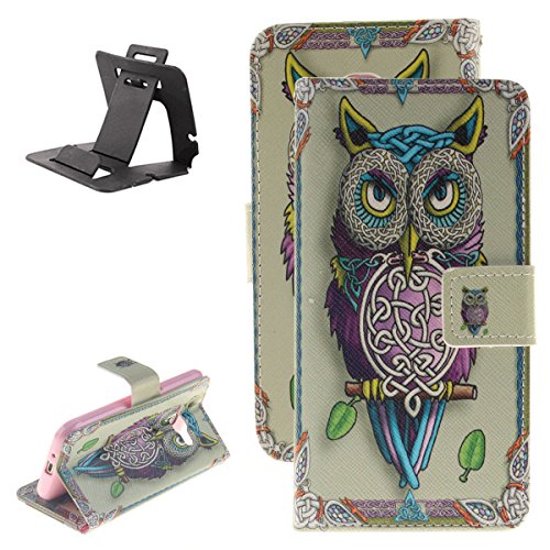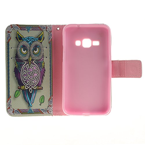 Keyye Samsung Galaxy J1 2016/J120 Premium Slim Disegno del portafoglio di cuoio dell'unità di elaborazione Chiusura magnetica Flip incassato Paraurti in gomma morbida [Con la scanalatura della custodia della carta e Titolare di contanti] Funzione di stand Resistente ai graffi Protezione della pelle Shell Pattern unico Copertura perfetta per Samsung Galaxy J1 2016/J120 + cavalletto in plastica nera(Carino gufo)
