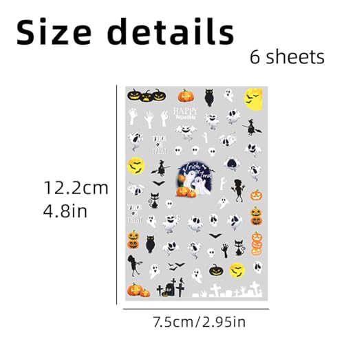 【Ampia applicazione】6 fogli di adesivi per nail art di Halloween con diversi modelli e stili, adatti a tutte le unghie, unghie dei piedi e punte delle unghie. Ideale per uso domestico e saloni di bellezza, può essere utilizzato anche per decorare custodie per cellulari, regali, ecc.
