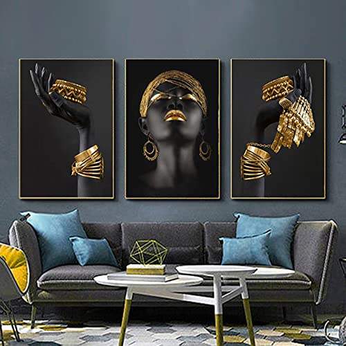 KHADR 3 Pezzi Quadro su Tela Arte Africana Donna in Oro Nero con Gioielli in Oro Quadri su Tela Poster per Soggiorno Camera da Letto Decorazione Domestica, Senza Cornice,70X100cm Senza Cornice