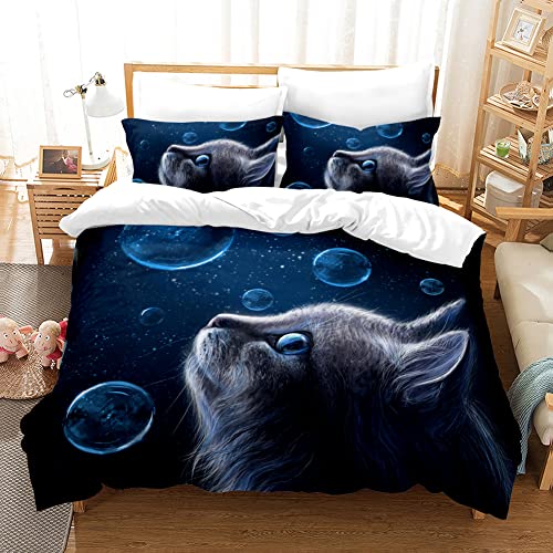 KHDFID Set copripiumino matrimoniale modello di gatti microfibra copripiumino gattino 220x240 cm e 2 federa 50x80 cm gatto blu scuro