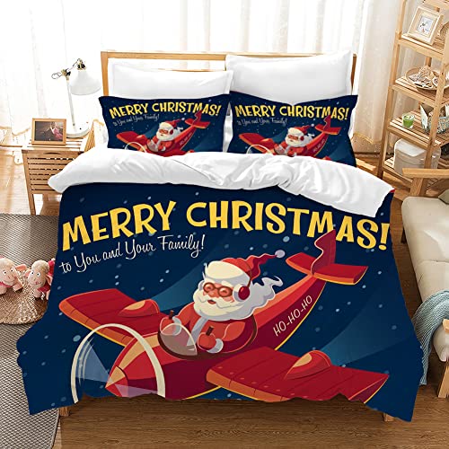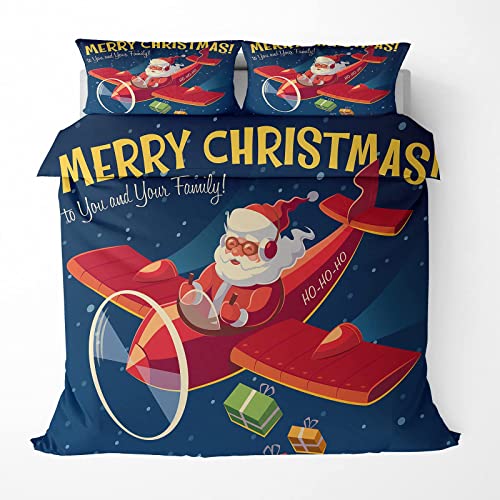 KHDFID Set copripiumino natalizio Stile C, 135 x 200cm Set biancheria da letto Babbo Natale che pilota un aeroplano, copripiumino 135 x 200cm con cerniera + 2 federe 50 x 80 cm