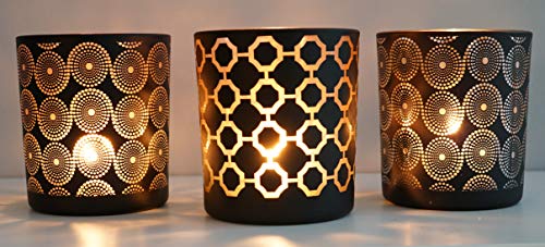 Khevga Portacandela antivento in vetro nero e oro, set da 3