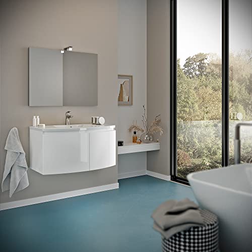 Base curva con ante sagomate e chiusura rallentata. Lavabo con vasca centrale e ampio bordo posaoggetti. Specchio con design moderno e superficie riflettente generosa.