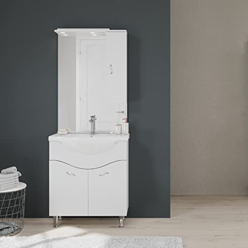Mobile bagno a terra da 75 cm con lavabo a pancia in ceramica. Specchio con faretti, presa ed interruttore. 4 piedini in ABS regolabili. Illuminazione a LED IP44 2X2W 6500K.