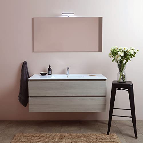 Mobile bagno con lavabo in ceramica ad una vasca, con foro troppopieno e rubinetto. Base con cassetti sotto lavabo con maniglia a gola e chiusura rallentata, scanso per il sifone. Specchio 120x60 con 2 lampade a led.