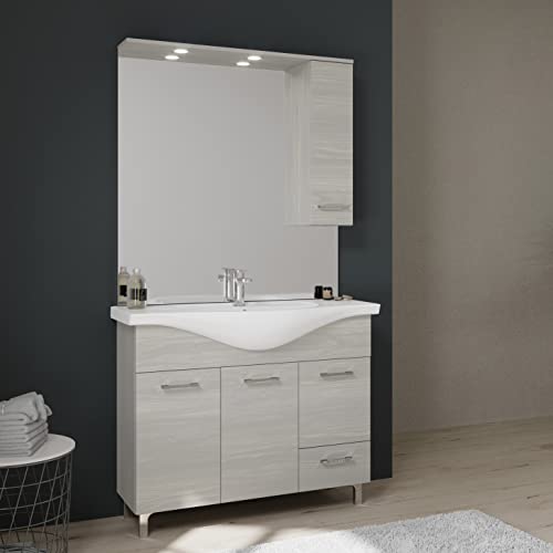 Mobile bagno a terra da 105cm con ante e cassetto, lavabo con foro rubinetto, troppopieno e specchio.