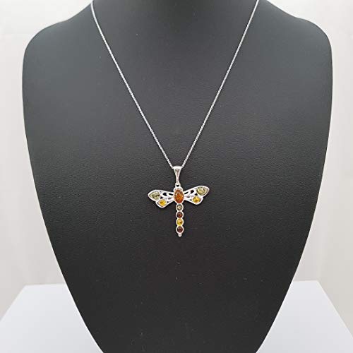 Kiara Jewellery - Collana con ciondolo a forma di libellula in argento Sterling 925 intarsiato con ambra baltica mista su catenina in argento sterling da 45,7 cm o catenina barbazzale.