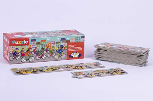 ogni puzzle contiene 30 pezzi, per un totale di 10 sequenazie diverse (ciascuna delle dimensioni 49 x 7 cm)