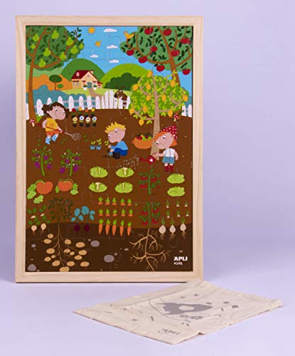 Include 28 pezzi di legno, una cornice con illustrazione stampata per rendere più facile il montaggio e una borsa in cotone organico per riporre le parti. Dimensioni: 254 x 5 x 376 mm.